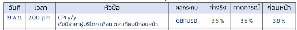 - 19 พ.ย. ประกาศตัวเลขเงินเฟ้อ หรือ CPI y/y เดือน ต.ค. = 3.6 % ซึ่งดีกวาเดือนก.ย. 3.8% แต่ยังคงไม่ดีพำพอตามระดับที่ตลาดคาด 3.5%