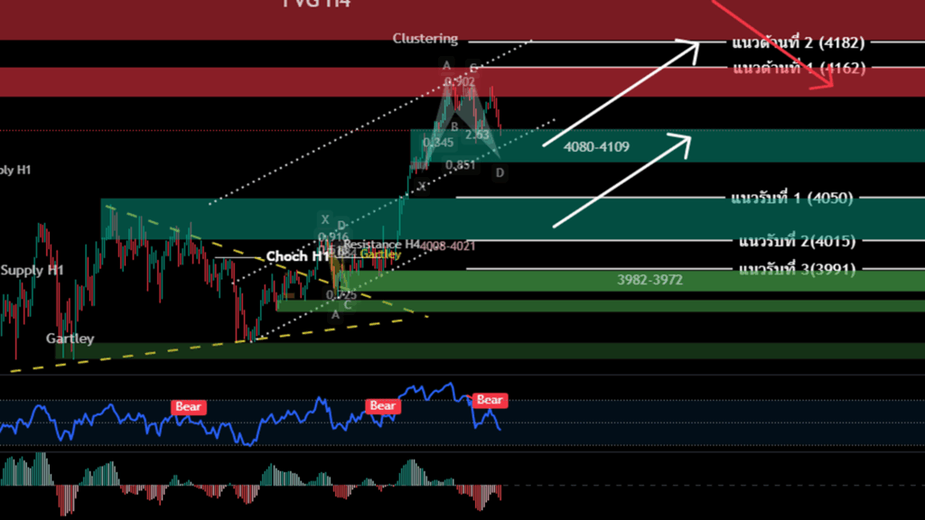 H4/H1 ทางเทคนิค ราทองคำยังคงเคลื่อนไหวในกรอบ Channel Uptremd H1  สามารถขึ้นไปทดสอบแนวต้าน 4136-4161 ก่อนปรับตัวย่อลงมา เริ่มปรากฎสัญยา Butterfly Hamonic เก็บกำไรระยะ Rebound ซึ่งเป็นแนวกรอบ ทดสอบ Channel Uptrend H1 / H4 retracement  ที่ 61.8 มีโอกาสที่จะขึ้นไปทดสอบ 161 Extension ที่ราคา 4180-4190 ได้เช่นกัน  แนะนำย่อซื้อ