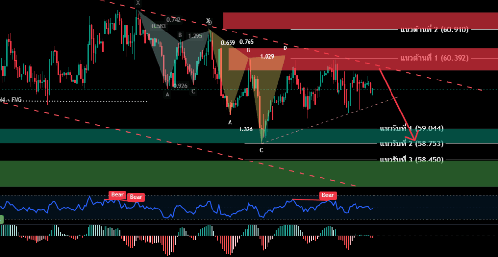 H4/H1  ราคายังคงเคลือ่นไหวออกข้างในลัษณะ Sideway Down ในกรอบ Channel Down trend รราคาเคลื่อนไหวในรกอบแนวรับและแนว้านที่ให้ไว้ ตามลำดับ /ยังคงเน้นการทำกำไรในกรอบ 60.392-58.450 ทั้งนี้ H1 มีการเคลื่อนไหวในกรอบ สามเหลี่ยม Triangle มีโอกาสที่ราคาจะปรับตัวเลือกข้างหลั้งจากนี้