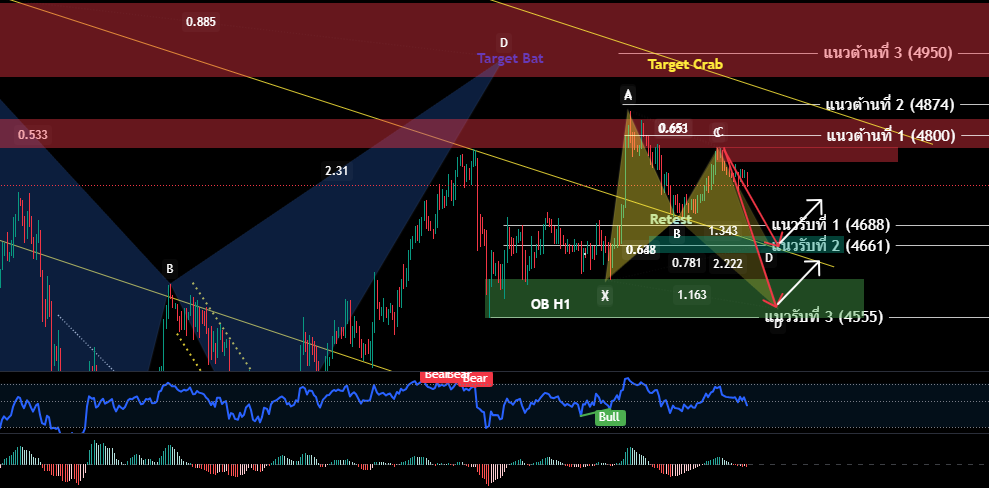 H4/H1 วานนี้ราคา Rebound ขึ้น หลังจากลงมา Retest กรอบ Channel Downtrend (ตามคาด) ราคายังคงวิงอยู่ในกรอบ Sideway ใหญ่ที่ให้ไว้ 4688-4800 ในโครงสร้างหลักยังคงเป็นเทรนด์ขาลงการยืนเหนือ 5050 ขึ้นได้เท่านั้น หน้า Buy จึงจะกลับมาอย่างเต็มที่ ขณะดียวกันเริ่มปรากฎสัญญาณ Hamonic Gartley หรือ Crab ให้ระวังแรงเทขาย