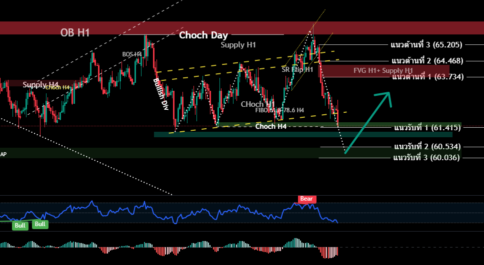 H4/H1 โครงสร้างราคายังเป็นการเคลื่อนไหวแบบ Sideway กรวยปากเปิด ราคามีการสร้าง High ใหม่ สูงจากเดิม และ มีการสร้าง Low ที่ตำลงจากเดิมเช่นกัน หากราคาปิดตำกว่า 61.415 ซึ่งเป็นจุด Choch H4 ถือว่าสิ้นสุดโครงสร้าขาขึ้นระยะสัน