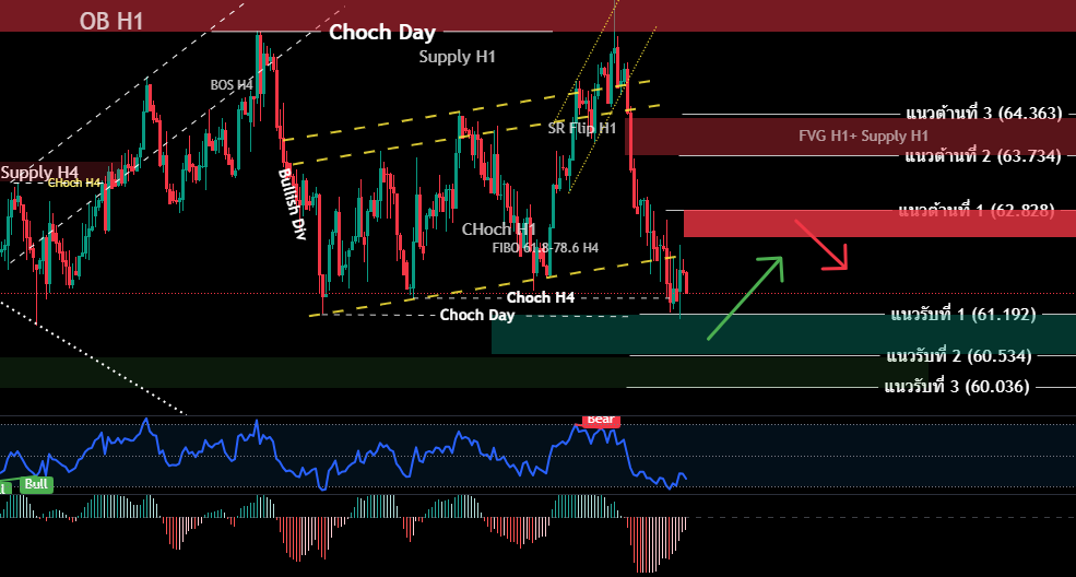 H4/H1 โครงสร้างราคายังเป็นการเคลื่อนไหวแบบ Sideway กรวยปากเปิด ราคามีการสร้าง High ใหม่ สูงจากเดิม และ มีการสร้าง Low ที่ตำลงจากเดิมเช่นกัน หากราคาปิดตำกว่า 61.415 ซึ่งเป็นจุด Choch H4 ถือว่าสิ้นสุดโครงสร้างขาขึ้นระยะสั้น