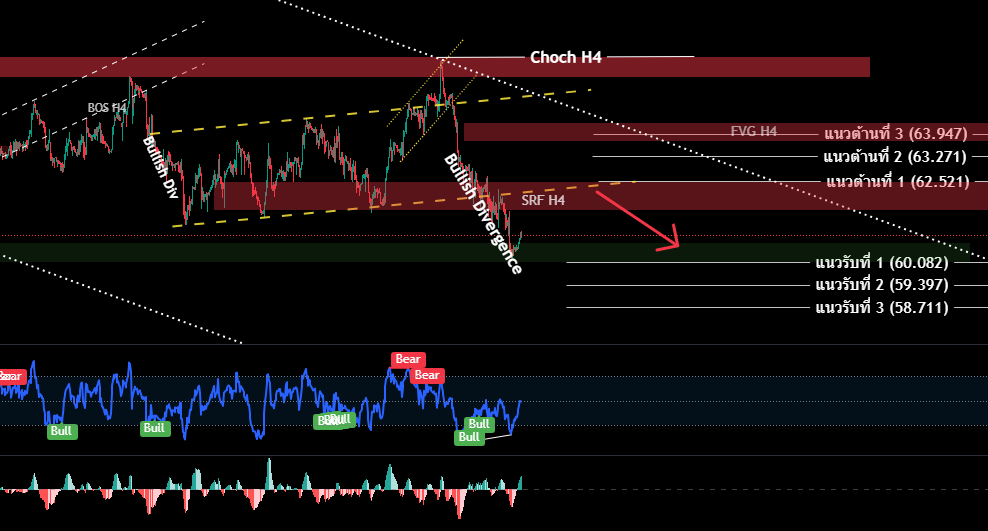 H4/H1 สิ้นสุดโครงสร้างเทรดน์ขาขึ้น ราคาปิดแท่่งรายวัน ที่ 60.082 ซึ่งต่ำกว่าจุด Choch Day 61.192 H1 ปรากฎสัญญาณ ฺBullish Divergence มีโอกาส rebound ก่อนปรับลงต่อ