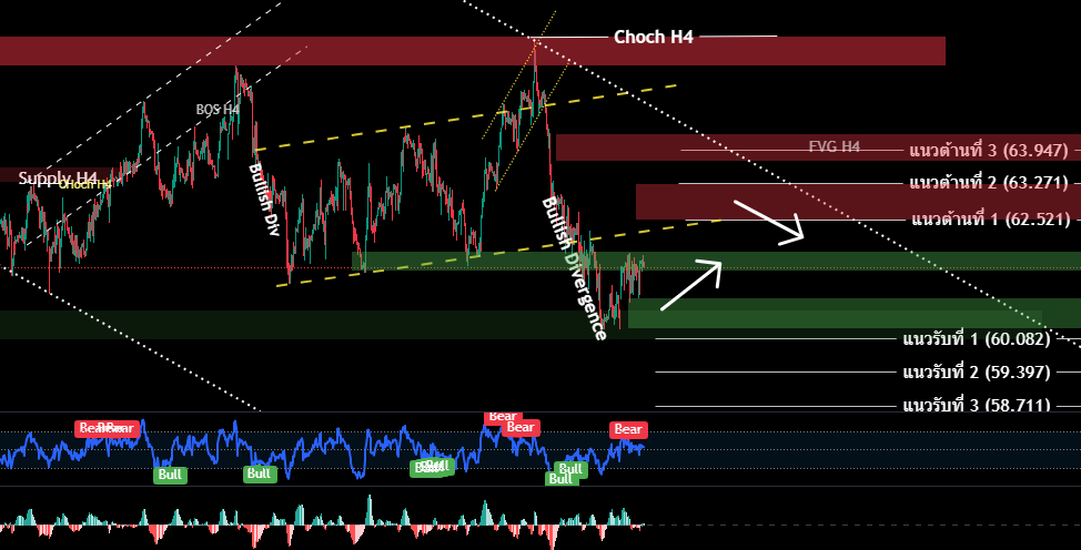 H4/H1 สิ้นสุดโครงสร้างเทรนด์ขาขึ้นระยะสั้น ราคาปิดแท่่งรายวัน ที่ 60.082 ซึ่งต่ำกว่าจุด Choch Day 61.192 หลุดกรอบ Channel Up trend H4 ลงมา ราคาน้ำมันพยายามทรงตัวขึ้นหลังจาก ลงมาทดสอบ แนวรับที่ให้ไว้ + สัญญาณ Bullish Divergence H1 มีโอากาสกลับขึ้นมาทดสอบแนวกรอบ Channel H4 เดิม