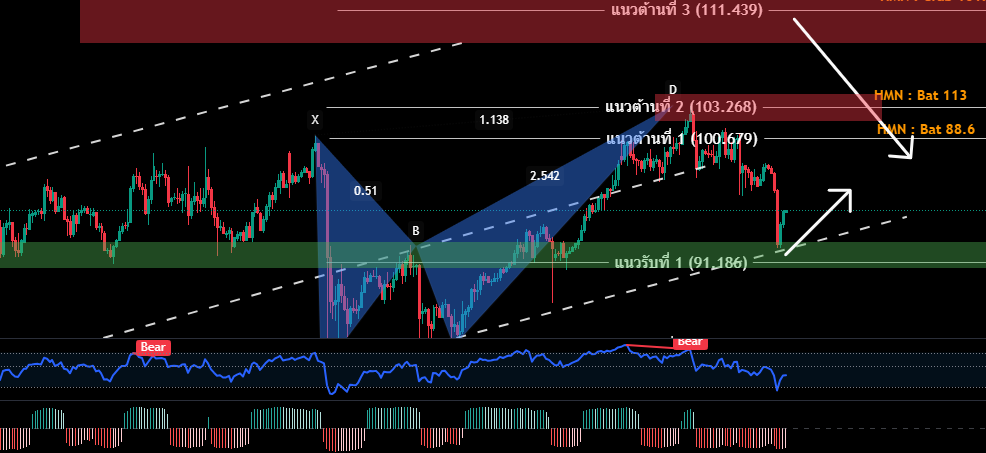 H4/H1 ราคาน้ำมันปรับตัวร่วงลง ในกรอบ Channel Uptrend ปรากฎสัญญาณ Hidden Bullish + Hamonic Bat 113 ราคาปรับตัวร่วงลงมาทันที่บริเวณแนวรับที่ให้ไว้ (ตามคาด)