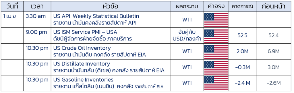 - ติดตามปริมาณ น้ำมันดิบคงคลัง วันนี้ หากออกมาเหมือน API สะท้อนปริมาณน้ำมันดิบยังคงมีมากใสหรัฐ แต่หากลดต่ำลง จะมีปัจจัยบวกต่อ ราคา WTI