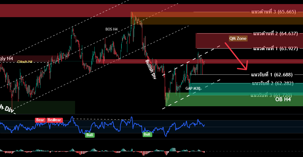 H4/H1 สินสุดโครงสร้างเทรนด์ขาขึ้น ราคปิดแท่ง H4 ต่ำกว่า 62.775 ซึง่เป็นจุด Choch หรือสิ้นสุดโครงสร้างขาขึ้น ระวังแรงเทขายบริเวณ Quasimodo Level