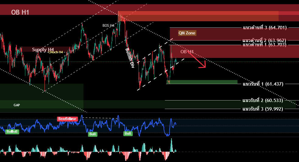 H4/H1 ราคาน้ำมันปรับตัวร่วงลงทะลุกรอบ Channel Uptrend H4 ลงมา แต่พยายามวิ่งกลับขึ้นไปในกรอบ H4 ราคายังไม่สามารถปิดต่ำกว่า61.178 ได้ จะไม่ถือวา โครงสร้างขาขึ้นโดนทำลาย ราคาวิ่งในกรอบ sideway 63.927-61.178