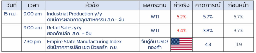• ประกาศตัวเลข ดัชนีการผลิตอุตสาหกรรม จีน และยอดค้าปลีกจีน เดือน ส.ค. ออกมาน้อยกว่าคาดและเดือนก่อนหน้า สะท้อนเศรษฐกิจจีนยังคงชะลอตัวทั้งภาคบริโภค และ ภาคการผลิต
