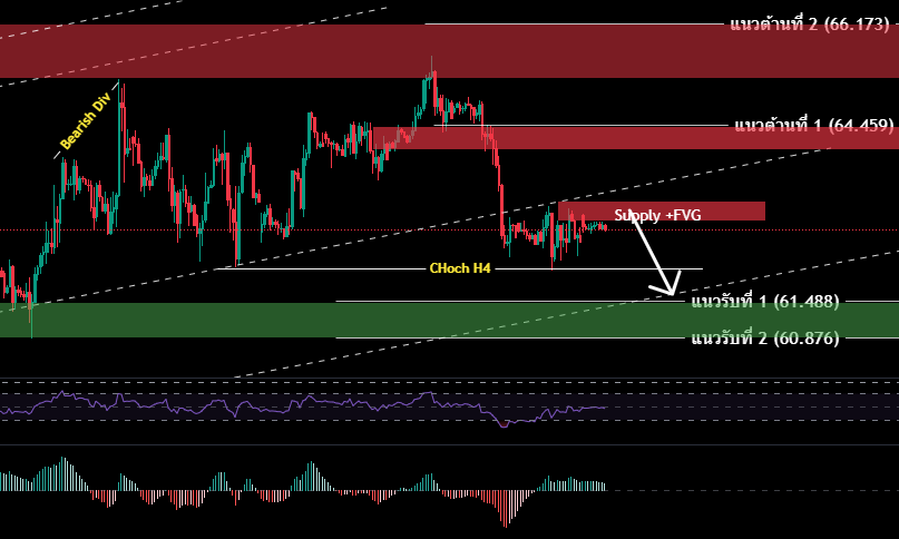 H4/H1 ราคาน้ำมันวิ่งลงมาทดสอบ จุด CHoch H4 @ 62.074 (จุดสิ้นสุดโครงสร้างเทรนด์ขาขึ้น)และดีดกลับขึ้นไป ยังคงถือเป็นการเคลื่อนไหวแบบ Sideway ออกข้าง จนกว่าปิดแท่งแดง H4 ต่ำกว่าจุดดังกล่าวได้จึงจะถือว่าการสิ้นสุดโครงสร้างขาขึ้นระยะสั้นได้