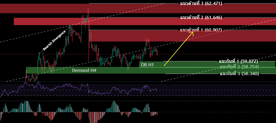 H4/H1 โครงสร้างยังคงเป็นเทรนด์ขาขึ้น ณ ปัจจุบันราคานัำมันปรับตัวย่อลงในระดับ 50.00% ที่ตรงกับ Demand H4 กรอบ 58.754-58.340 ปรากฎสัญญาณ Bullish Divergence H4 ราคา Rebound ขึ้น ตามคาด แต่ทั้งนี้ยังคงเคลื่อนไหว Sideway Up กรอบ 60.437 -58.781