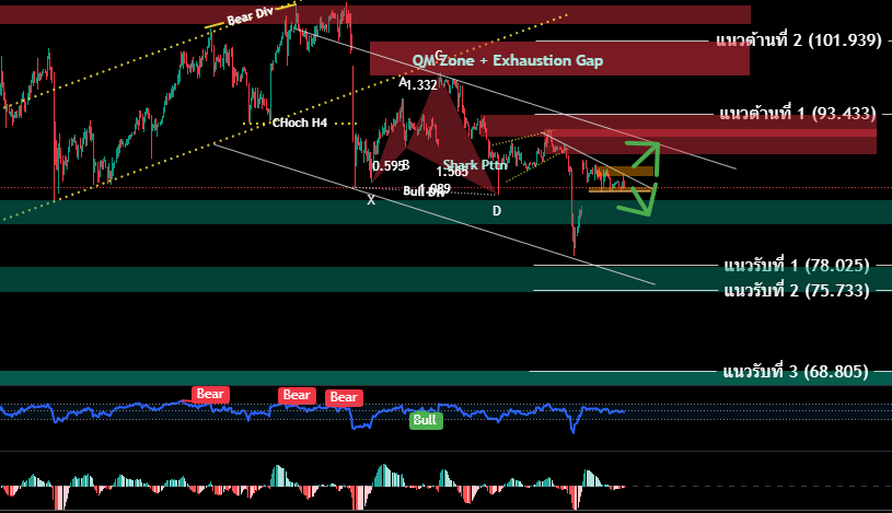 H4/H1 สิ้นสุดโครงสร้างเทรนด์ขาขึ้นระยะสั้น ราคาขึ้นมาทดสอบกรอบ QM zone 101.620-97.872 และยังคงปรับร่วงลงต่อ ตามสัญญาณ Rising Wadge Pttn ทันทีที่ขึ้นทดสอบกรอบ 91.047-93.194 ราคาปรับตัวร่วงลง (ตามคาด) แม้ว่าจะมีการ Rebound ขึ้นมาในช่วงเช้า แต่ยังไม่สามารถกลับมายืนเหนือ 91.735 ซึ่งเป็นจุด Choch H4 ขาลงระยะสั้นได้ ราคายังคงเคลื่อนไหวใน Channel Down trend ในขณะที่วานนี้ยังเป็นการเคลื่อนไหวในกรอบ สาเหลี่ยม รอเลือกข้าง