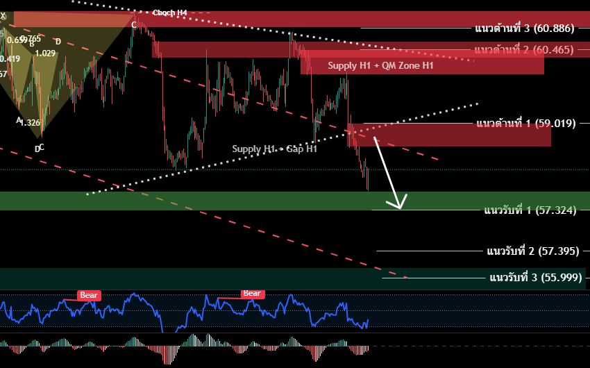 H4/H1 ราคาน้ำมันยังคงเป็นการเคลื่อนไหวโครงสร้างเทรนด์ขาลง ราคาเบรกกรอบ สามเหลี่ยมปรับตัวร่วงลงระดับแนวรับ 57.697-57.314 ในโซน Oversold อาจจะเห็นการ rebound เพื่อลงต่อ