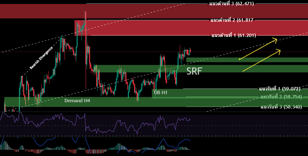 H4/H1 โครงสร้างยังคงเป็นเทรนด์ขาขึ้น ณ ปัจจุบันราคานัำมันปรับตัวย่อลงในระดับ 50.00% ที่ตรงกับ Demand H4 กรอบ 58.754-58.340 ปรากฎสัญญาณ Bullish Divergence H4 ราคา Rebound ขึ้น ตามคาด ปัจจ้ยบวกต่อน้ำมันในระยะนี้ยังมีอยู่เน้นย่อ Buy ทำกำไรระยะสั้น