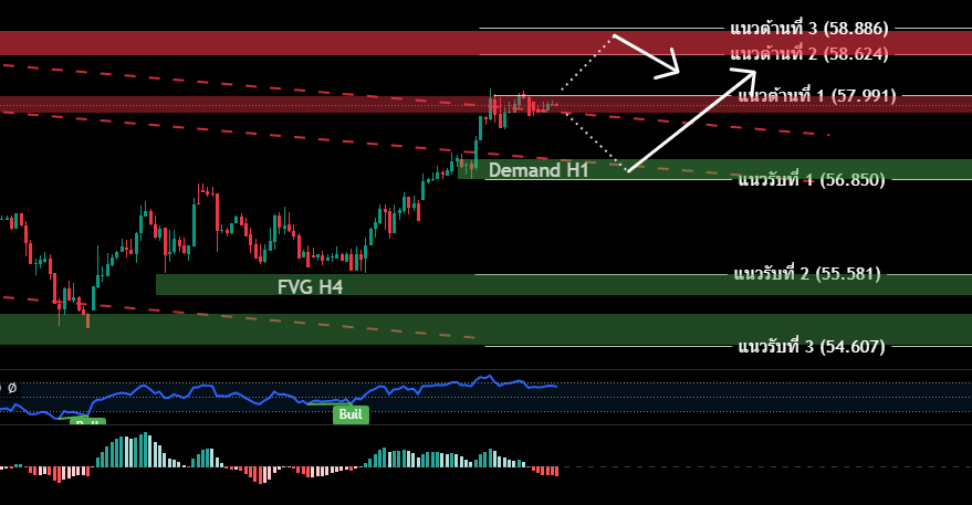 H4/H1 สิ้นสุดโครงสร้างเทรนด์ขาลง ราคาน้ำมันสามารถยืนเหนือ จุด Choch H4 @56.458 และกำลังพยายามเคลื่อนที่ทะลุขึ้นเหนือ Channel Downtrend