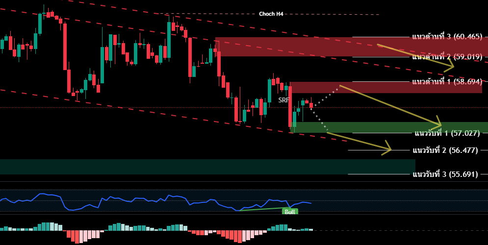 - หากราคาปรับตัวร่วลงทันที ให้พิจารณากรอบ 57.404-57.027 ให้พิจารณาเปิดสถานะขาย (รอสัญญาณขาย) หากราคาปิดแท่งแดง H1 ต่ำกว่า 57.027 / SL 58.000 เพิ่อทำกำไร 56.934/56.851/56.778/56.714/56.531/56.444/56.363/56.199