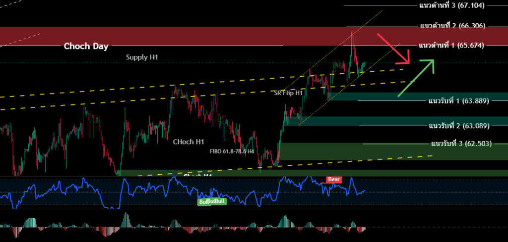 H4/H1 ในภาพใหญ่ ราคาน้ำมันยังเป็นการเคลื่อนที่ Sideway Up ราคาน้ำมันยังคงไม่สามารถยืนแท่งรายวันบริเวณ Choch Day (จุดสิ้นสุดโครงสร้างขาลง) ที่ระดับ 65.656 ได้ ได้ในขณะที่ TF H4 และ H1 เริ่มปรากฎสัญญาณ Bearish Divergence มีโอกาสที่ราคาจะย่อตัวลงปรับฐาน