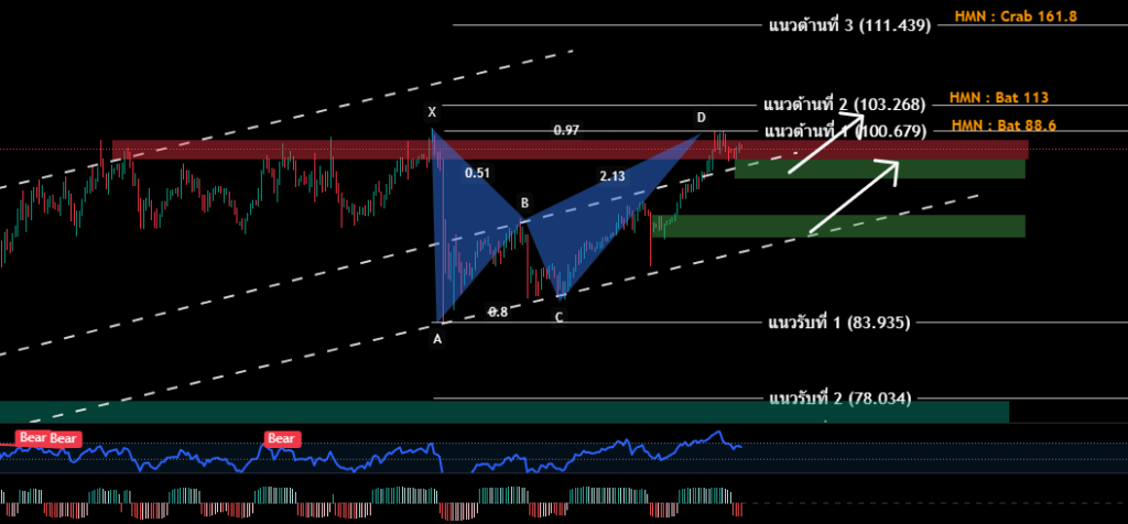 H4/H1 ราคาน้ำมันยังวิ่งเป็นโครงสร้าง เทรนด์ขาขึ้น ใน Channel Uptrend และดีดตัวกลับขึ้นไปได้ หลังมีสัญญาณ Hidden Bullish ราคาขึ้นไปตาม Hamonic Bat or Crab Pttn (ตามคาด) ในภาพใหญ๋ ยังคงวิ่งในกรอบ sideway ระดับ 91.078-99.837