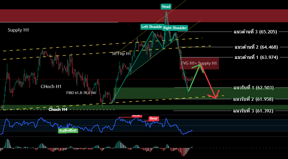 - เปิดสถานะขาย (รอสัญญาณขาย) ทีกรอบ 63.381-63.969/SL 64.000 เพื่อทำกำไรที่ 63.1635/63.040/62.950/62.717/62.320/62.204/62.037