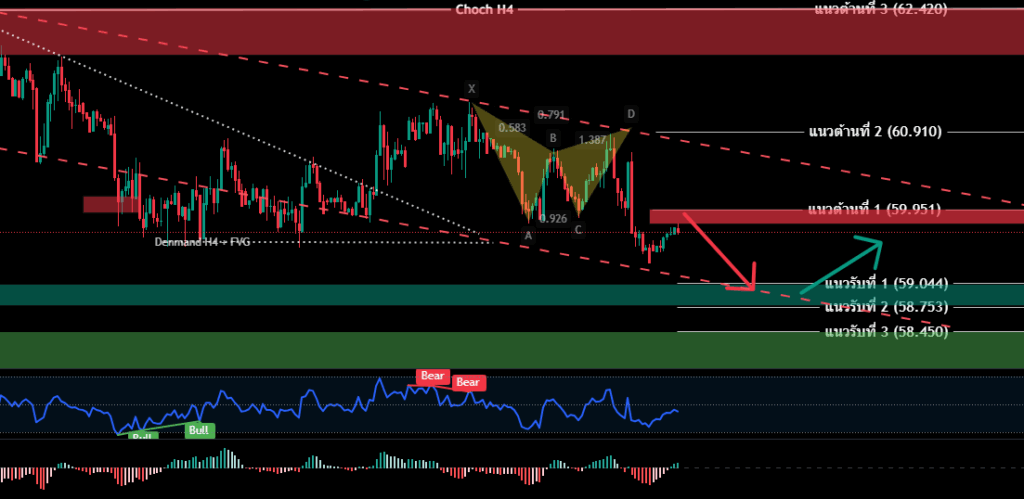 H4/H1 ราคายังคงเคลือ่นไหวออกข้างวานนี้พยายามขึ้นมาทดสอบ แนวต้าน 4044-4021 ที่ไห้ไว้ และปรับตัวร่วงลง (ตามคาด)ในรูปแบบ Gartley Hamonic Prrn ราคากลับมาบริเวณแนวรับ 59.725-59.114 ซึ่งเป็นระดับ Demand H 4+ FVG Day เช้านี้เริ่มปรากฎการ Rebound ขึ้นของราคา