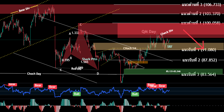 Week/Day สัปดาห์ที่ผ่านมาราคาน้ำมันปิดเขียว Bullish ในรูปแบบ PA Harami ซึ่่งมีโอกาศที่จะ Rebound ขึั้นต่อ ในขณะที่ Day ยังคงเป็นการเคลื่อนไหวออกข้างแบบ Sideway Down สิ้นสุดโครงสร้างเทรนด์ขาขึ้นระยะสั้น CHoch Day 84.084 ณ ปัจจุบันราคาขึ้นมาทดสอบกรอบ QM Day 99.933-94.982 แต่ยังคงไม่สามารถทะลุขึ้นไปได้ กลับย่อตัวลงมา บริเวณ กรอน SRF H4 ที่ 91.047-93.194 อีกครั้งก่อนที่จะ rebound ขึ้นในช่วงเช้าวันนี้