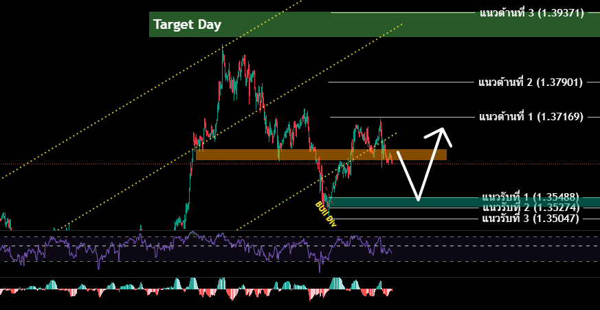 • เปิดสถานะขาย (รอสัญญาณขาย) กรอบ 1.36496-1.36255 /SL 1.36800 เพื่อทำกำไร 1.36024/1.35888/135825/1.35690/1.35565
