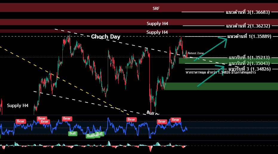 H4 H4/H1 โครงสร้างราคายังคงเป็นเทรนด์ขาลง ราคาไม่สามารถยืนเหนือ H4 ที่ 1.35885 (Choch Day) ราคากลับลงมาทดสอบ บริเวณกรอบแนวรับ Channel Downtrend