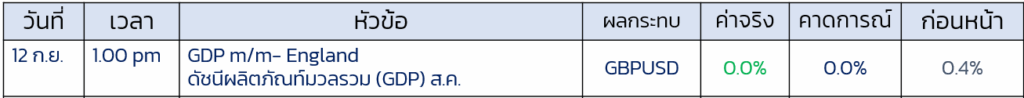 - ประกาศ GDP เดือน ส.ค. ออกมา 0.00% ตามคาด ไม่ได้สะท้อนความแข็งแกรงเศรษฐกิจของ GBP … ปัจจัยกดดันGPB เล็กน้อย(ตามคาด)