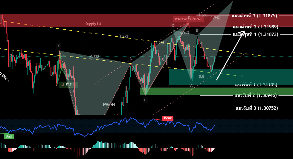 H4/H1 ราคา GBP พยายาม Rebound ขึ้นแต่ยังไมสามารถทะลุแนวต้านกรอบ Channel Downtrend ขึ้นไปได้ มีโอกาสย่อตัวสะสมกำลัง ปรากฎ Butterfly หรือ Deep Crap เพื่อดีดพ้นกรอบ Channel Downtrend