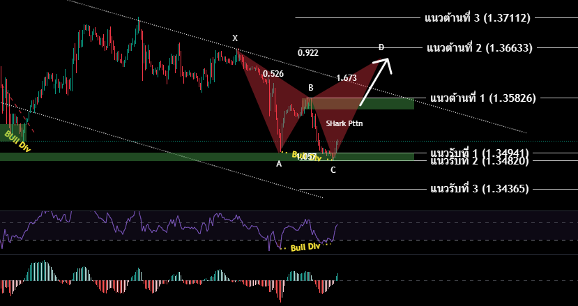 H4/H1 GBP ยังคงเคลื่อนไหวในกรอบ Channel Downtrend มีแรงเทขายอย่างต่อเนื่องติดต่อกัน 3 วัน ร่วงเข้าสู่แนวรับ 1.34941-1.34820 เริ่มปรากฎสัญญาณ Bullish Divergence H1- H4 ทั้งใน โซน Oversold เริ่มปรากำภาพ HM Shark Pttn