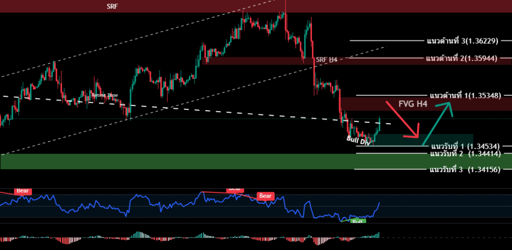 H4/H1 ราคาทะลุ Channel Uptrend ลงมาแต่ยังไม่ถึงแนวรับที่เคยให้ไว้ 1.34419-1.34156 เนืองจากปัจจัยข่าวกดดัน USD เร็วกว่าคาด ราคาปรับตัวร่วงลง 1.34534 ปรากฎสํญญาณ Bullish divergence H1 มีโอกาสที่จะ Rebound ขึ้นในระยะสั้น