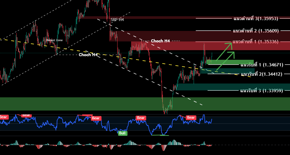 H4/H1 ราคาพยายาม Rebound ขึ้น แต่ยังคงไม่สามารถยืนเหนือ จุด Choch H4 1.35336 ที่เป็นจุดสิ้นสุดโครงสร้างเทรนด์ขาลงขึ้นไปได้ ราคาติดแนวต้าน Supply H4