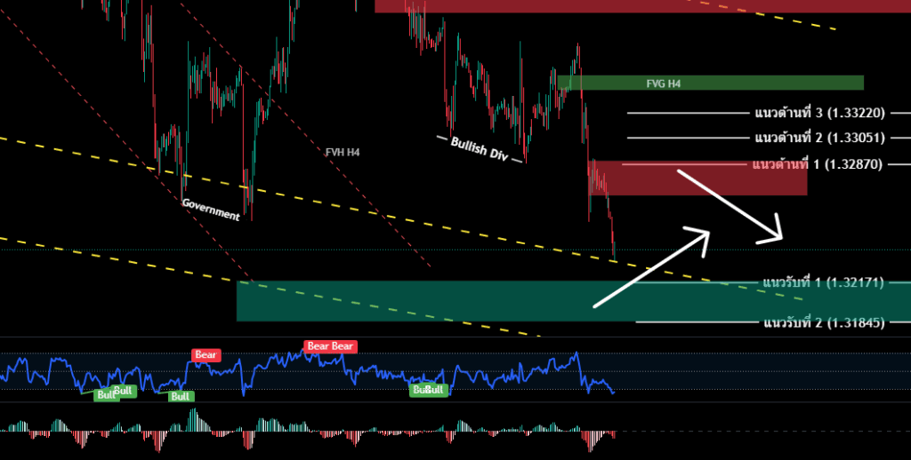 H4/H1 ราคา GBP ยังคงเคลื่อนไหวในเทรนด์ ขาลงอย่างขัดเจน ใน Channel Downtrend ราคากลับลงมาทดสอบบริเวณแนวรับ 1.33110-1.32844 เป็นครั้งที่ 2 และมีโอกาสที่จะปรับตัว Low ต่ำกว่าเดิม