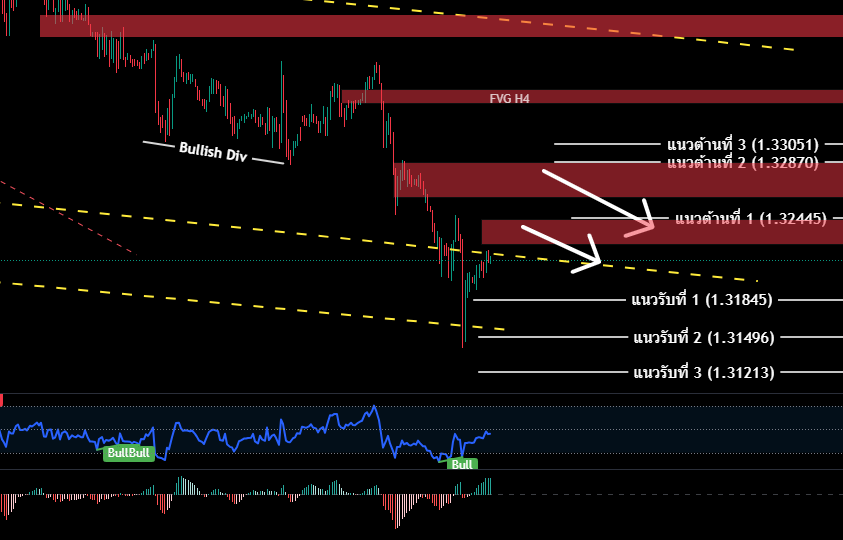 Day วานนี้ราคา GBP ปรับตัวร่วงลงในช่วงเช้า แม้ว่าราคาพยายามจะดีดตัวขึ้นบริเวณแนวรับที่ให้ไว้ในช่วงค่ำ แต่ดีดขึ้นได้ไม่ไกล ราคาร่วงลงบริเวณ แนวรับ 1.31541 ในทันที ที่ถ้อยแถลงของพาวเวล์และอาจจะมีการชะลอการลดดอกเบี้ยในครังหน้า และหยุด QT (ลดขนาดของงบดุล) ส่งผลให้ USD(DXY) แข็งค่า กดดดัน GBPในช่วงหลังจากแถลง ราคาถูกเทขายออกมาจนมีสัญญาณซื้อทางเทคนิค ส่งผลให้ราคาดีดกลับขึ้นมาอยู่แนวรับเดิมก่อนที่จะร่วงลงไปในช่วงช่าว ปิดแท่งรายวัน Bearish Hammer