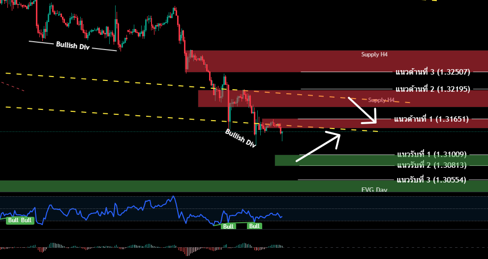 H4/H1 ราคา GBP ยังคงเคลื่อนไหวในกรอบ Channel Downtrend เทรนด์ขาลงอย่างต่อเนื่อง เริ่มปรากฎสัญญาณ การ Bullish Divergence H1 เกิดขึ้น บริเวณ Oversold มีดโอกาสที่ราจะ Rebound ขึ้น