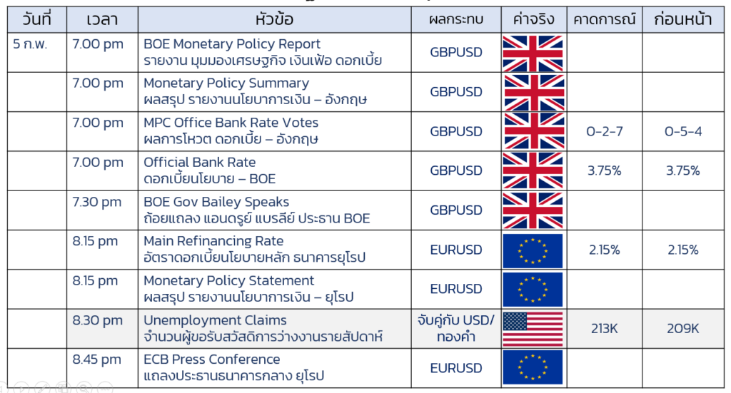 - ติดตามประกาศดอกเบี้ยนโยบายฝั่งอังกฤษ คาดคงที่ 3.75% ตลอดจนถ้อยแถลงของ แอนดรูย์แบลี่ย์ หากส่งสัญญาณรีบลดดอกเบี้ยอังกฤษ GBP จะปรับตัวร่วงลงแรง แต่หากยืนยันไม่รีบร้อนปรับลดดอกเบี้ย จะเป็นปัจจัยบวกต่อ GBP เช่นกัน