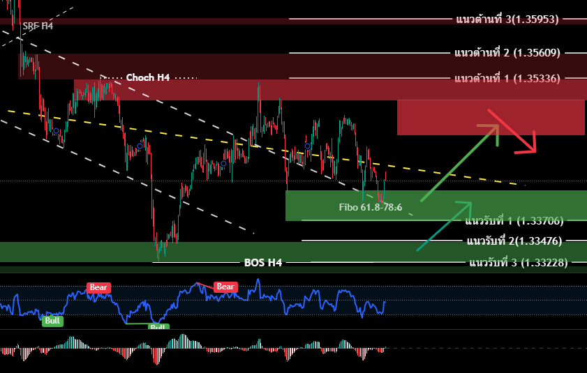 H4/H1 ยังคงเป็นการเคลื่อนไหวออกข้าง ในแนว ลด Low – ลด High ในกรอบ Sideway ใหญ่ 1.353336 – 1.33228 แต่ยังไม่ปรับลงใน Channel Downtrend H1 มีโอกาสกลับลงมาทดสอบกรอบแล้วดีดขึ้นได้ตลอด