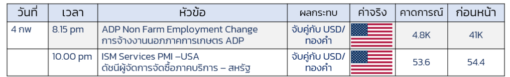 • ติดตาม PMI – ภาคบริการ หากออกมาสูงกว่า 50.0 จะเป็นปัจจัยบวกต่อ USD และกดดันทองคำ