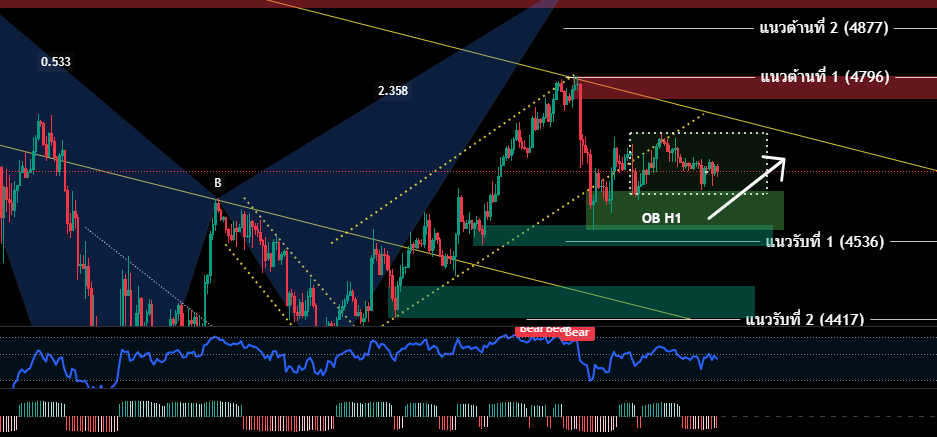 H4/H1 โครงสร้างหลักยังคงเป็นเทรนด์ขาลง ราคากลับเข้ามาเคลื่อนไหว ใน Channel Downtrend H4 อีกรอบ หลังจากร่วงออกจากกรอบไป ต้งแต่วันที่ 19 มี.ค. วานนี้ – วันนี้ ราคายังคงเคลือนไหวออกข้าง กรอบ 4610-4706 ระหว่างรอความคืบหน้าสงคราม