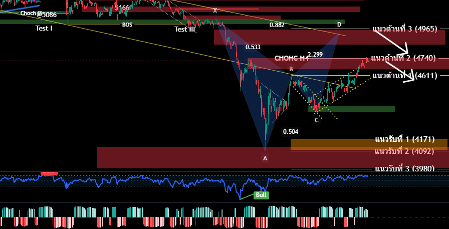 H4/H1 ทองคำกลับเข้าไปใน Channel Downtrend และหากสามารถยืนเหนือ4740 ได้ จะถือว่าสิ้นสุดโครงสร้างเทรนด์ขาลง ในขณะเดียวกัน ราคาทองคำวิ่งไต่ระดับ Channel Uptrend ในระดับย่อย ทั้งนี้ ยังคงมีโอกาสที่จะขึ้นไปทำเป้า Hamonic Bat 113 แต่ระวังแรงขายสลับทำกำไร ลงมาก่อน