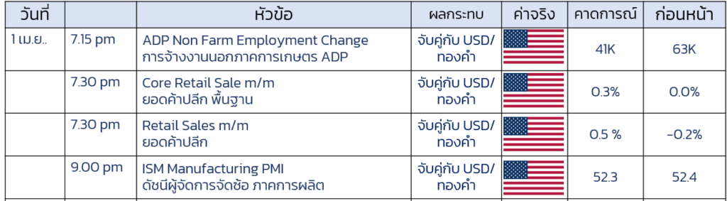 • ติดตามดัชนีผุ้จัดการจัดซื้อ ภาคการผลิต หากตัวเลขออกมาน้อยกว่า 50 จะเป็นปัจจัยกดดัน USD แต่จะเป็นบวกต่อทอง