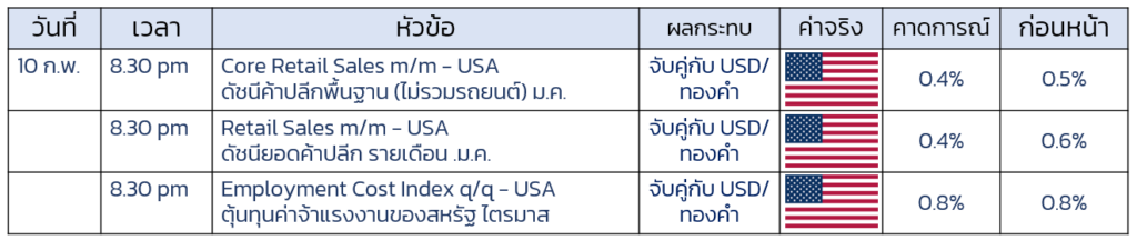 - ติดตามตัวเลขประกาศ Core Retail Sales และ Retail Sales ซึ่ง Fed จะให้ความสำคัญกับ Core Retail Sales (ยอดขายไม่รวมยานพาหนะ) หากตัวเลขออกมาต่ำกว่าคาดมากๆ น้อยกว่า 0.4% สะท้อนว่าเศรษฐกิจ (ค่าใช้จ่าย) เริ่มชะลอตัว ซึ่งจะเป็นผลบวกต่อทองคำ แต่หาก เท่ากับคาดการณ์ หรือเดือนก่อนหน้า 0.4-0.5% ก็ยังคงอยู่ในสภาวะทั่วไป ซึ่งค่าใช้จ่ายเดือน ม.ค. มักจะน้อยกว่าเดือน ธ.ค. เป็นเรื่องปรกติ และจะไม่มีปัจจัยบวกโดยตรงต่อทองคำ