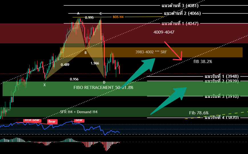 H4/H1 ราคาทองคำมีแรงเทขายออกมาเชิงเทคนิค ราคาอยู่ในช่วง Overbought ราคากลับเข้ามาวิ่งใน กรอบ Channel Uptrend H4 (เส้นประขาว) ราคาย่อลงมาระดับ ใกล้เคียง Fibonacci Retracement 50% แล้วดีดกลับขึ้นทันที แต่ยังไม่ผ่านแนวต้าน SRF 3983-4002 ขึ้นไปได้ มีการเคลื่อนไหวออกข้าง สร้าง Pattern Shark Hamonic เพื่อสะสมกำลัง แสดง่ารอบของการสร้าง ATH ที่ 4059 จบแล้ว