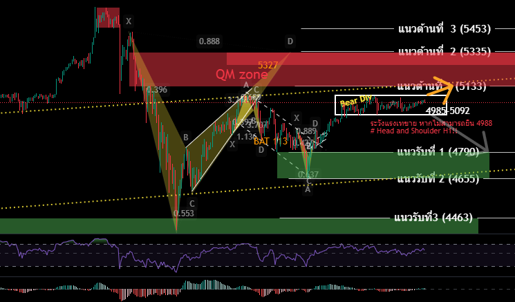 H4/H1 โครงสร้างเป็นเทรนดืขาขึนทีสามารถไปถึงระดับ QM Zone (5335-5133) ณ ปัจจุบันแก่ง่ตัวในกรอบ 5092-4985 เพื่อ accumulate ก่อนเลือกข้าง แนวต้านถัดไป อยู่ระดับ 5133 แต่หากหลุด 4985 มีโอกาสที่จะย่อตัวหนัก แตะ 4790-*4655 ได้เช่นกัน