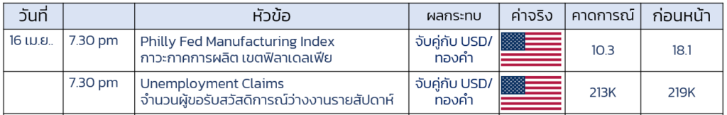 - 15 เม.ย. ประกาศตัเลข ดัชนีภาคการผลิต เขตนิวยอร์ก Empire State Manufacturing Index แตะระดับ 11.0 ในขณะที่เดือน ก.พ. – 0.2 และสูงกว่าคาดการณ์0.3 สะท้อนเศรษฐกิจในเขตนิวยอร์ก (เขตเศรษฐกิจกลางที่สำคัญ) ออกมาดี ปัจจัยบวกต่อ USD เล็กน้อย