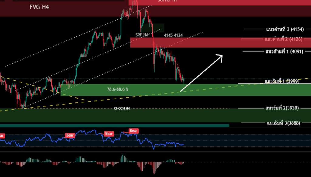 H4/H1 ราคาทองคำพักฐานคร้งใหญ่(ตามคาด) ณ ปัจจุบันที่ราคา 3998 ซึ่งอยู่ระดับ Fibo Retracement ที่ 78.6% เริ่มปรากฎ Di- Bullish Divergence บริเวณกรอบแนวต้าน Channel uptrend ทั้งนี้หากกรอบ 3964-3999 ไม่สามารถรับได้อยู่มีโอกาสหลุดโครงสร้างขาขึ้นระยะกลาง