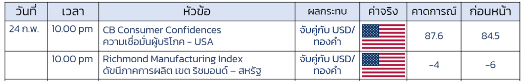 - ติดตามประกาศ ความเชื่อมันผู้บริโภค หากมากกว่าคาดการณ์ จะเป็นปัจจัยบวกต่อ USD และกดดันราคาทองคำได้