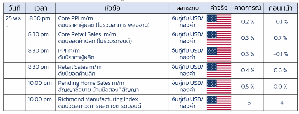 - จากถ้อยแถลง จอห์ วิลเลียม ประธานเฟดนิวยอรค (รอง FOMC) ในวันศุกร์ 21 พ.ย. ผู้มีสิทธืลงคะแนนเสียง – อัตราดอกเบี้ยสามารถลดลงได้ โดยไม่กระทบต่เงินเฟ้อ เพื่อช่วยป้องกันการชะลอตัวของตลาดแรงงาน