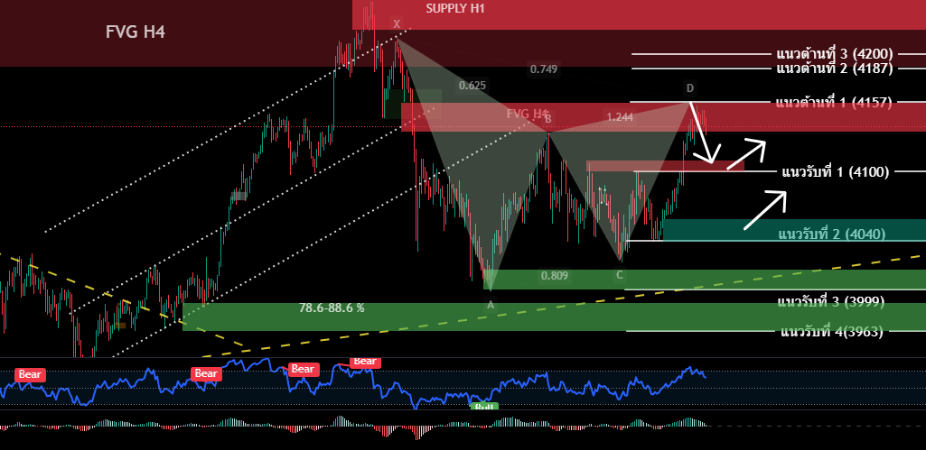 H4/H1 วานนี้ราคาทองคำสามารถเบรคกรอบ 4030 – 4109 ขึ้นมาได้ ราคายกเหนือ ระดับ 4133 ซึ่งถือว่าสิ้นสุดโครงสร้างเทรนด์ขาลงระยะสั้น หากราคายืนเหนือ 4084 ได้มีโอกาสที่จะ ปรับตัวขึ้นต่อได้ แต่ขณะเดียวกันเริ่มปรากฎภาพ Hamonic Gartley H4 มีโอกาสที่ราคาจะย่อลงมา 4060 ได้เช่นกัน ดังนั้นปัจจัยข่าวในวันนี้จะเป็นการกำหนดทิศทางราคา