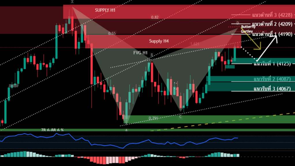 H4/H1 แม้ว่าวานนี้ราคา ทองคำจะเคลื่อนไหวในกรอบสั้นๆ 4159-4108 แต่ภายในโครงสร้าง Timeframe เล็ก ยังคงเป็นการยก High Low ขึ้น / TF H4 สามารยยืนเหนือ 4132 ซึ่งเป็นจุด Choch สิ้นสุดโครงสร้างขาลงระยะสั้นได้สำเร็จ มุมมองเชิงบวกเรื่มกลับมา ประกอบกับเริ่มปรากฎ Harmonic Gartley และ Butterfly บริเวณกรอบ 4190-4209 ซึ่งมีดโอกาสที่จะดีดตัวขึ้นก่อนย่อตัวลงมา